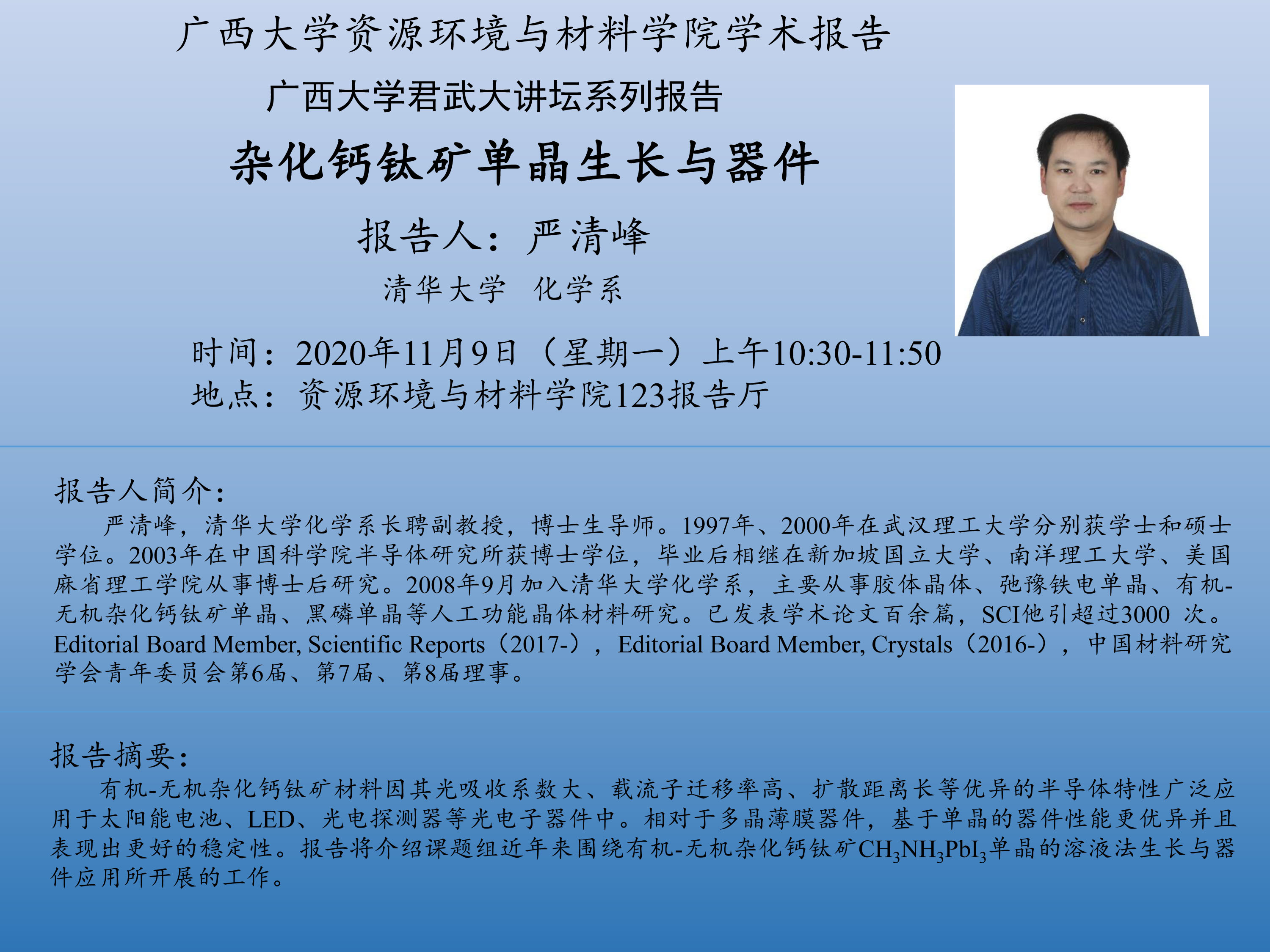 资源环境与材料学院学术报告:“beat365官方网站君武大讲坛系列”杂化钙钛矿单晶生长与器件