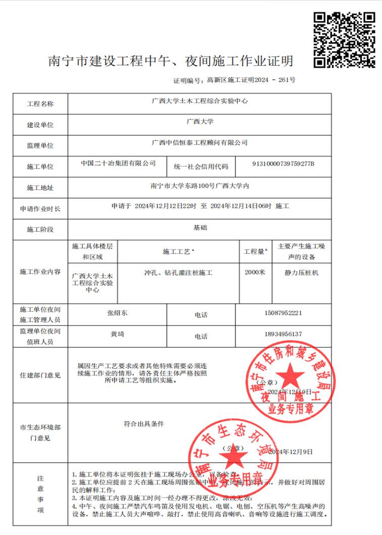 我单位承建的beat365官方网站土木工程综合实验中心项目因施工工艺需要,在符合法律许可的夜间施工条件之下,经南宁市住房和城乡建设局、南宁市生态环境局核准,计划于2024年12月12日22:00—2024年12月14日6:00进行静压桩施工。我单位将严格按照建设局、环保局要求,采取有效措施尽可能减少影响。施工期间可能会对广大师生员工的日常生活造成一定的干扰。对此,我们深表歉意,敬请谅解。